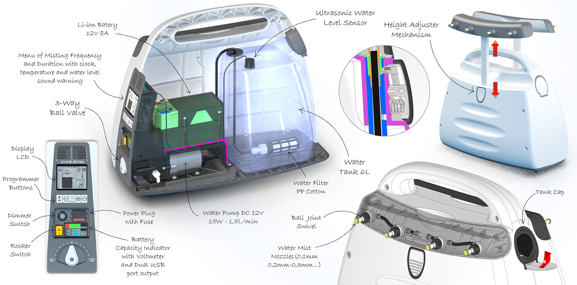 ES.- ¡Una apasionada por tomar largas sesiones de bronceado tuvo una idea! Se le ocurrió un sistema tecnológico para refrescarse sin tener que preocuparse por nada mas que disfrutar de lo que más le gusta… ¡Así nació DVA System! Un dispositivo de vaporización acuoso diferente. El primer paso fue contactar con un amigo Ingeniero para desarrollar un prototipo casero con bajo presupuesto en base a sus indicaciones y registrar la patente. La gran ventaja y novedad inventiva es la disposición de una batería recargable con un sistema de control consiguiendo un dispositivo autónomo y programable, además puede ser dirigible gracias a unos brazos donde se encuentran los pulverizadores. La patente consta de diferentes sistemas de alarma con sensores y otras consideraciones adicionales como posibles disposiciones de los elementos entre otros.